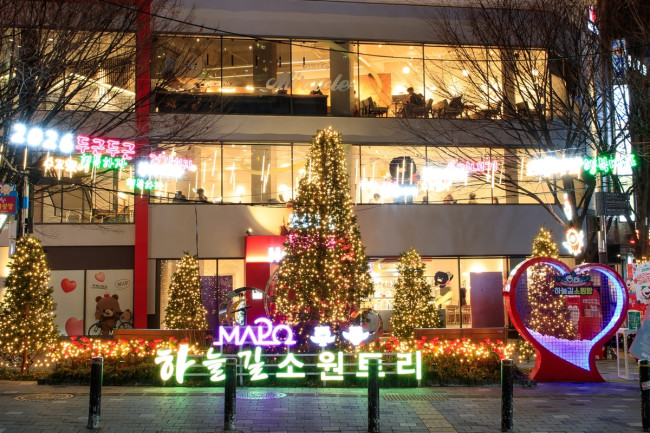 이와 함께 빛거리는 하늘길 상권 내 독막로 300m와 토정로 300m 구간에 걸쳐 설치된 가로수 66주에 전선형 LED 조명을 감아, 은은한 빛의 길을 형성하며 따뜻하고 낭만적인 겨울의 풍경을 선사하고 있다.