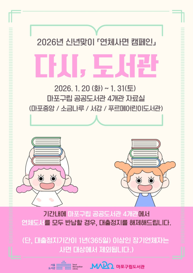 마포구(구청장 박강수)는 2026년 새해를 맞아 도서 연체로 도서관 이용이 제한된 구민이 다시 도서관을 이용할 수 있도록 돕고, 일상 속 독서 참여를 확대하기 위해 연체사면 캠페인 '다시, 도서관'을 운영한다.