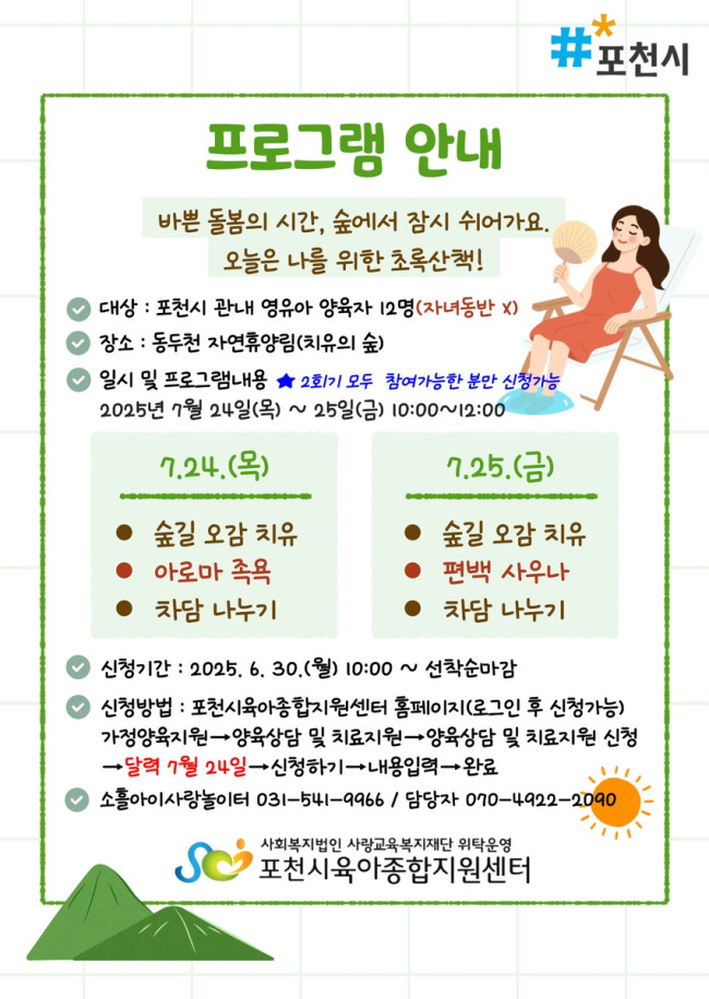 포천시육아종합지원센터는 오는 7월 24일(목)부터 25일(금)까지, 자연휴양림(치유의 숲)에서 영유아 양육자를 위한 힐링 프로그램 '함께, 숲마실 - 나를 위한 초록산책'을 운영한다고 밝혔다.