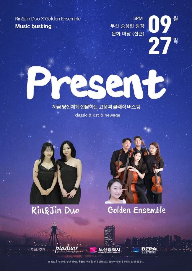 이번 공연은 부산시와 부산경제진흥원, Piaduos가 주최주관한 가운데 전석 무료로 진행되며공연은 린앤진 듀오(Rin&Jin Duo)와 골든앙상블(Golden Ensemble)의 클래식 공연과 OST, Newage(재해석한 음악곡들을 선보일 예정이다.