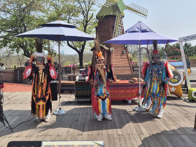 24일, 행담도 휴게소에서 남미 인디언 악기의 연주가 진행되고 있다. 임강유 기자